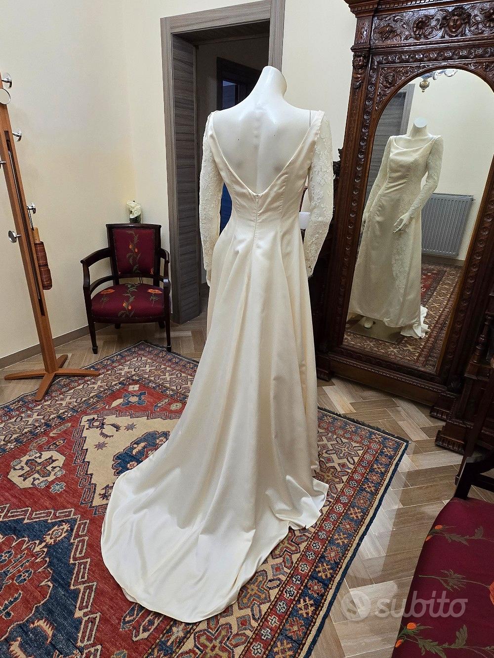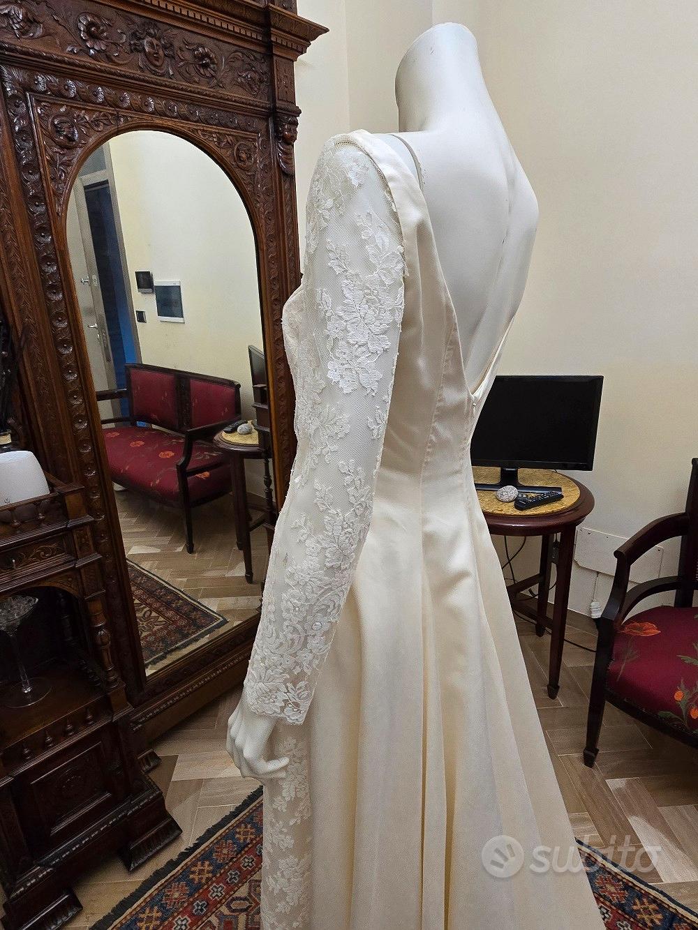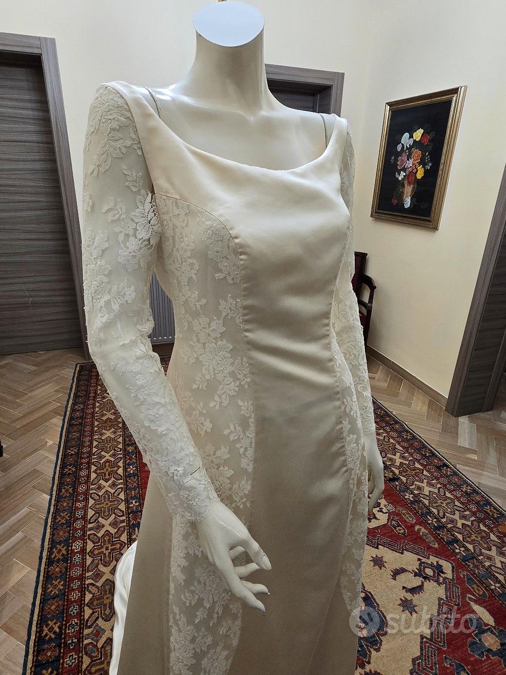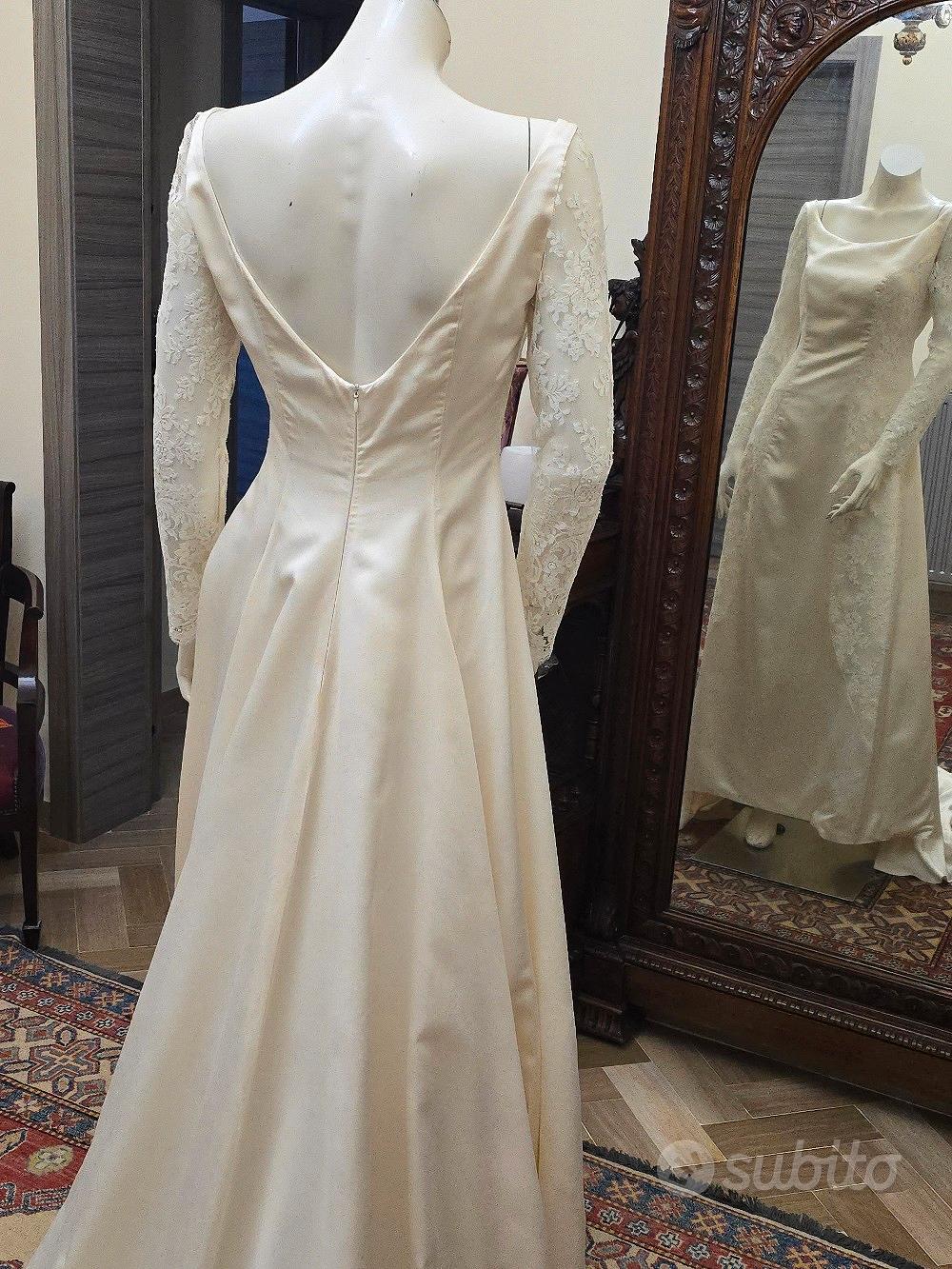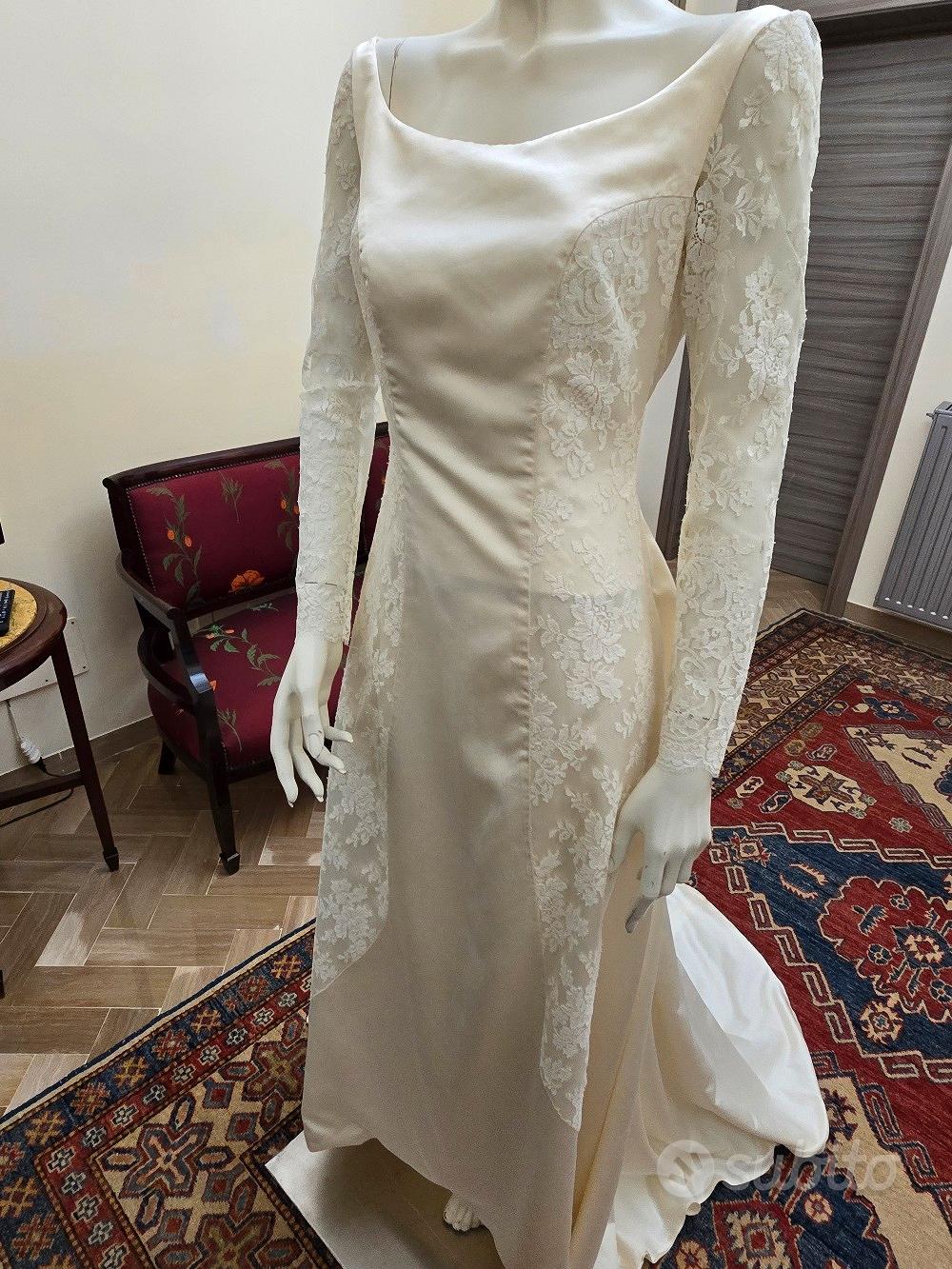 Descrizione Vestito in raso di pura seta con maniche e intarsi in pizzo francese. Colore avorio chiaro. tg.44. Mai indossato. Un affare strepitoso.