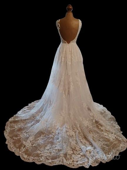 Abito da sposa in pizzo floreale con scollo a V e schiena scoperta.