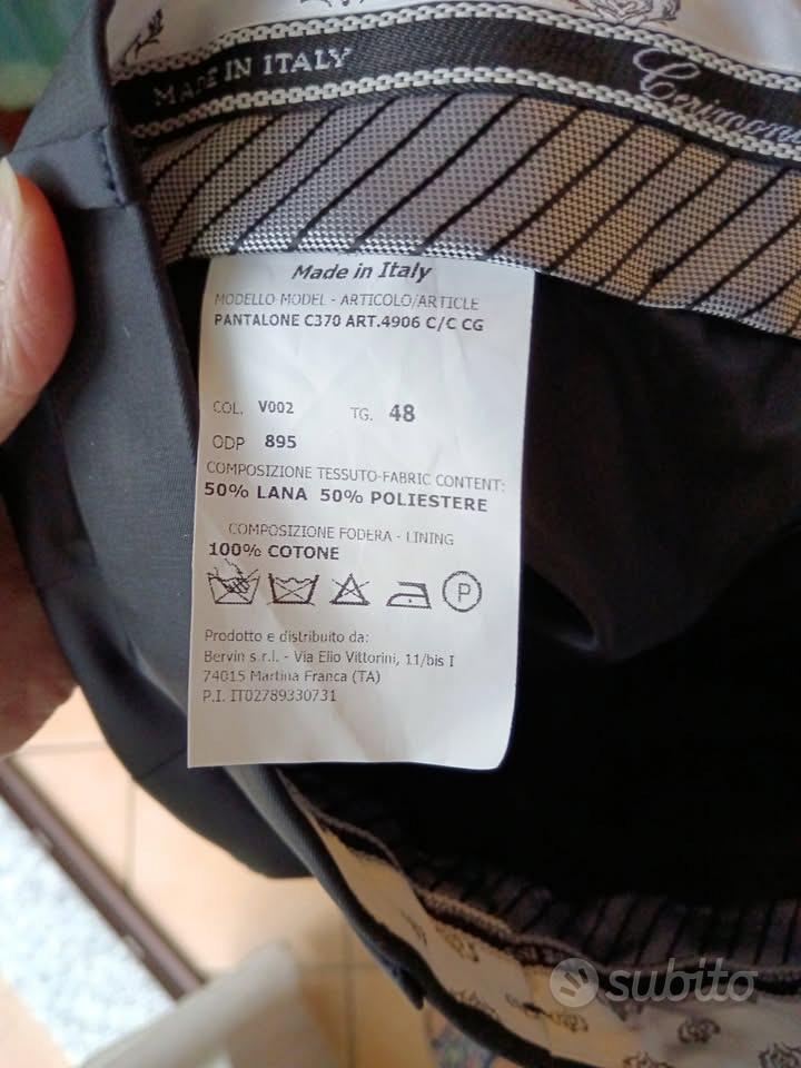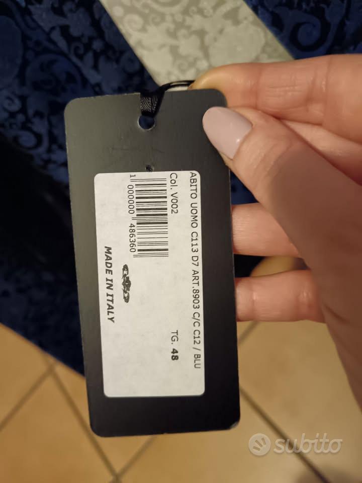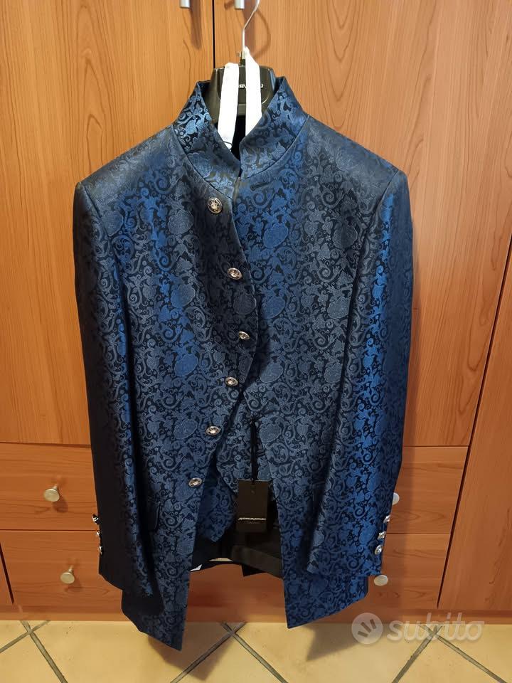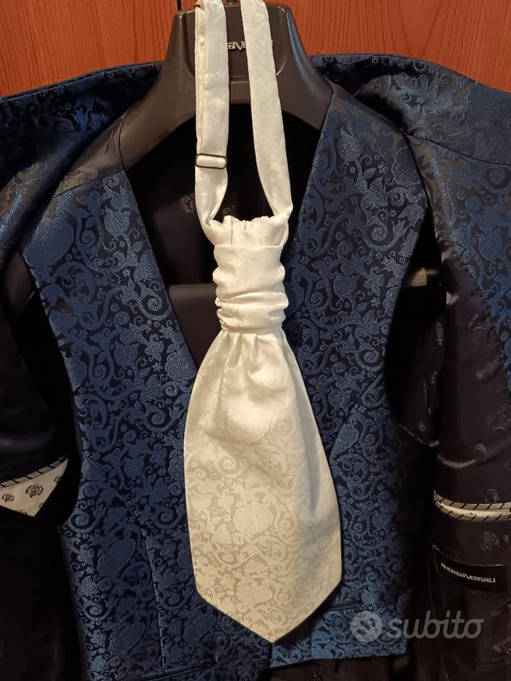 Descrizione Vendo abito da sposo MAI USATO stilista Andrea Versali, TG. 48 damascato blu completo di giacca, gilet, cravattone, pantaloni e custodia originale ritiro a mano o a carico acquirente